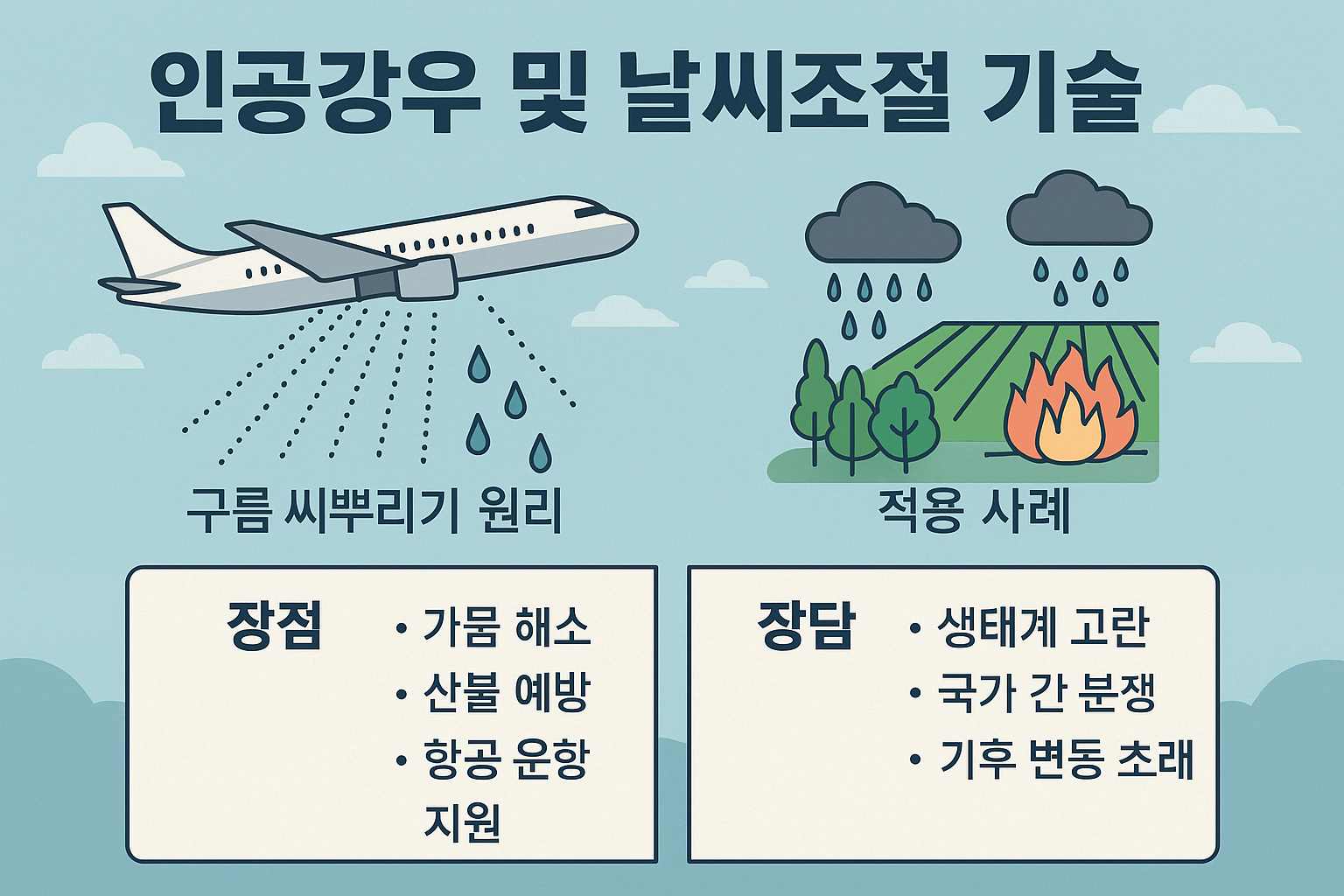인공강우는 비가 오지 않는 지역에 구름을 자극해 강우를 유도하는 대표적인 날씨조절 기술입니다. 전 세계적으로 기후위기 대응, 가뭄 해소, 산불 예방, 미세먼지 저감 등을 위해 관심이 커지고 있지만, 동시에 날씨 인공조작 부작용과 생태계 교란에 대한 우려도 제기되고 있습니다.