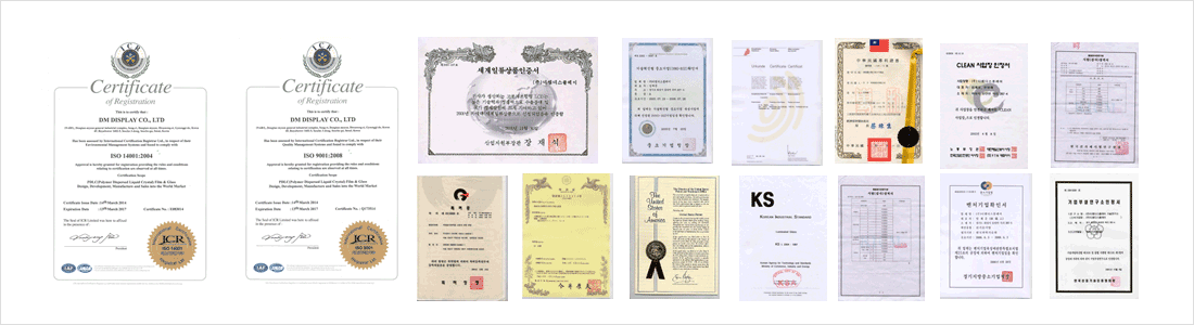 DMDisplay는 RoHS 준수를 포함한 ISO 9001 및 14001 인증을 보유하고 있습니다. 또한, 한국 정부에 의해 세계 최고의 제품을 생산하는 제조 업체로서 CEO 한국 기업들 협회가 최고의 기업가 상을 받았습니다.