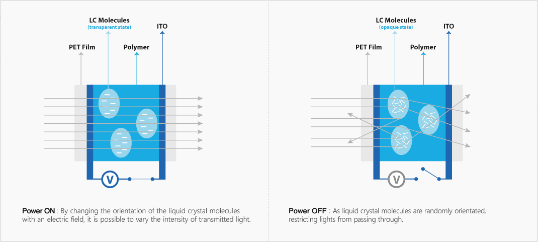 PDLC(Polymer Dispersed Liquid Crystal)은 고분자와 액정을 혼합하여 전기가 인가되지 않을 때는 액정 분자가 무질서하게 배열되어 빛을 산란시켜 불투명하게 보이며, 전기가 인가될 때는 액정 분자가 전기 방향으로 정렬되어 빛을 통과시켜 투명하게 보이는 원리의 기술입니다.