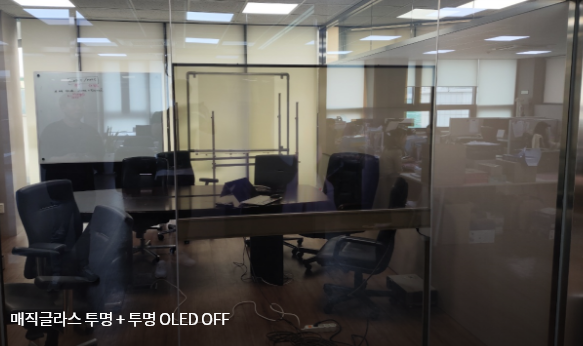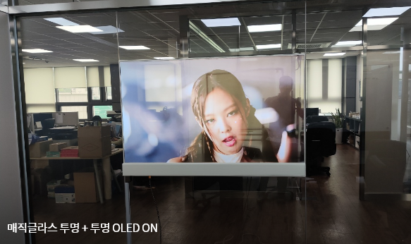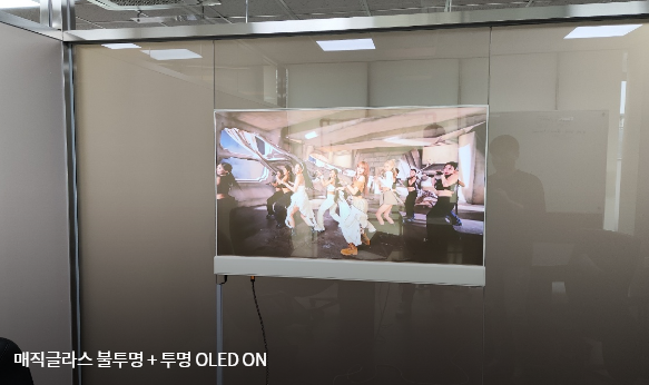 매직글라스(PDLC)에 투명 OLED를 접목한 시스템입니다. 투명 OLED는 LG디스플레이에서 직접 제조한 제품입니다.