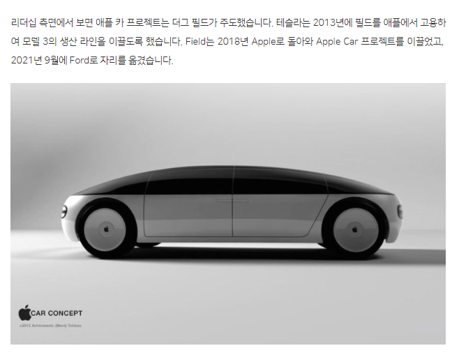 애플은 국가별 친환경 규제와 시장 요구 등 요인으로 인해 전기차 시장의 성장세가 가팔라지고 있는 점을 고려해 전기차 시장에 뛰어들었다. 지난 2018년 테슬라 출신 더그 필드 부사장을 영입했고, 미국 증권가에서 ‘애플이 자금난에 시달리는 테슬라를 인수할 적기’라는 분석이 제기되기도 했다.